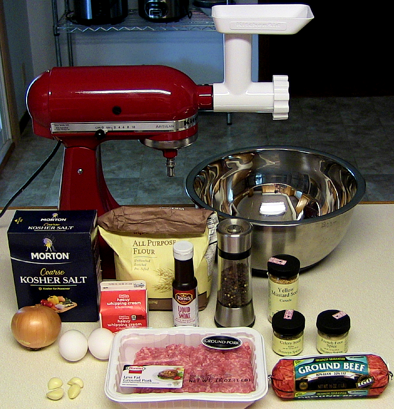 Step 2: Process the ground beef and ground pork through the fine grind plate of a meat grinder. Add the spices and mixture of flour, eggs and heavy cream. Mix well and continue working the mixture in order to develop a smooth emulsion.