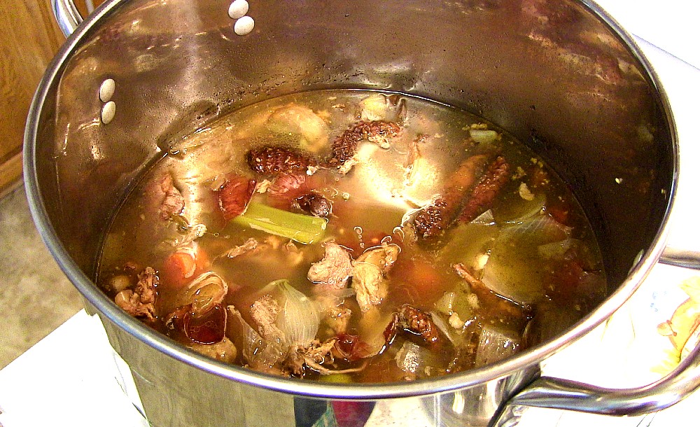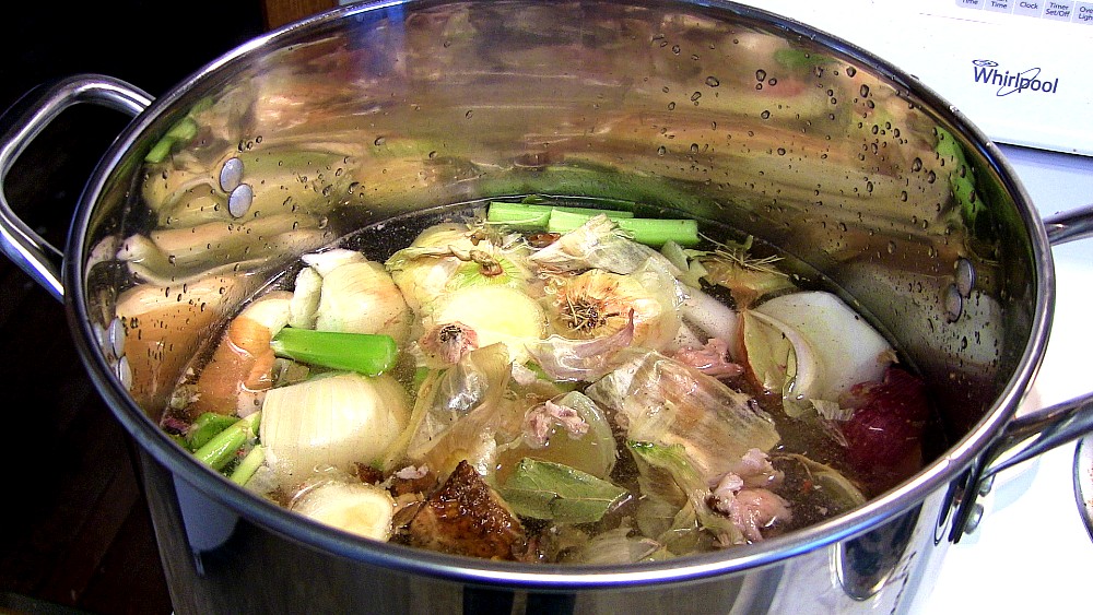 This year for Thanksgiving, I smoked a 14 lb. turkey and froze the carcass. We also saved and froze all the skins and leftover bits of the onions, carrots and celery we used when doing all our Thanksgiving cooking. Everything went in the pot to make stock.