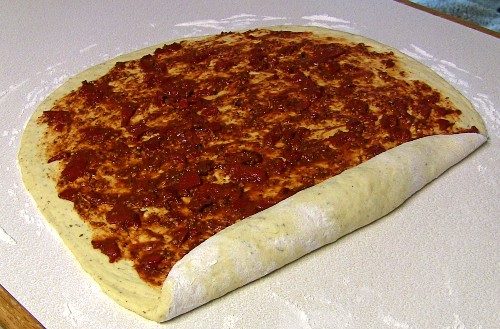 Step 1: Combine flour, cheese, milk powder, Italian herb seasoning, yeast and salt for the dough. Add egg, olive oil and water and mix well. Knead for 10 minutes and set aside in an oiled bowl. Cover and let rise until doubled in size, usually about an hour.