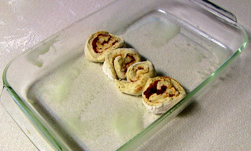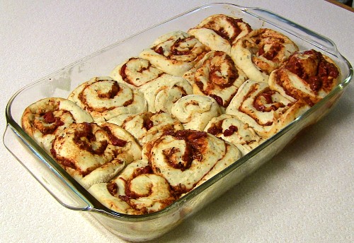 Step 5: Roll up lengthwise from one end to the other to form a cylinder. Slice into approximately two inch rounds and arrange in an oiled 9″ x 13″ pan. Place the thinner outer slices in the middle of the pan and fill up the rest of the pan with the fatter rolls from the inner part of the cylinder. The rolls will bake better that way. Let rise for about 30 minutes.
