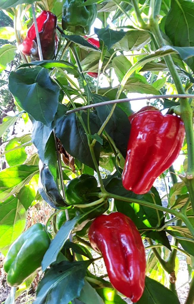 Roasted Bell Peppers are easily available in jars at grocery stores and can be used in this recipe as a substitute for homegrown peppers. Ausilio Peppers are medium heat, so adjust to taste with crushed red pepper flakes.
