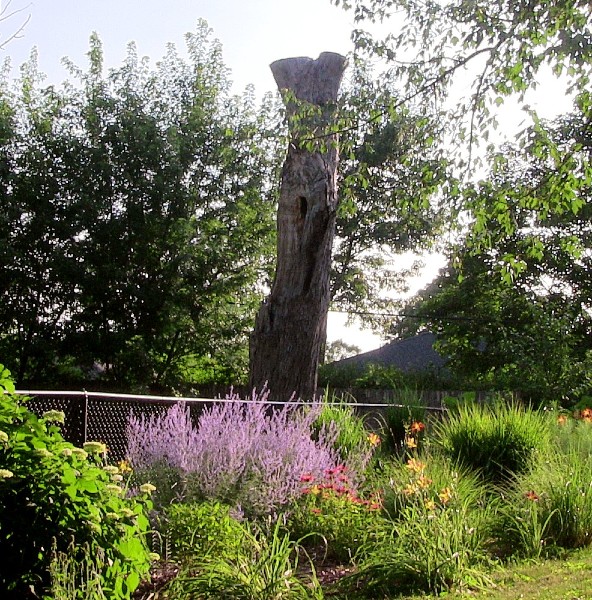 Our neighbors did an insightful thing by leaving the majority of the dead tree standing because it is a home for squirrels, birds and insect life. On our side of the fence, we’ve converted a great deal of our backyard into a pollinator-friendly perennial garden. We’re rewarded with copious firefly displays at dusk and bee and butterfly activity during the day. The increased bird activity keeps damaging insects like Japanese beetles in check without having to resort to chemicals.