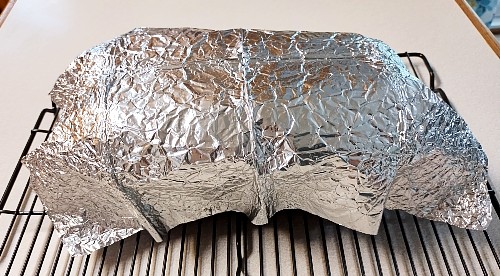 Step 3: Preheat the oven to 350°F. and bake for 45 minutes, tenting the bread with aluminum foil half-way through the baking time and rotating the pan. This prevents the bread from browning too much.