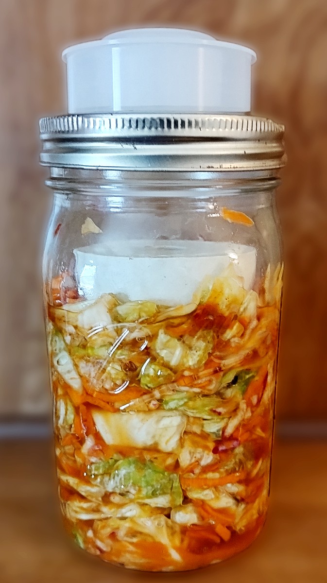 Tasty kimchi recipe in a wide-mouthed quart jar.