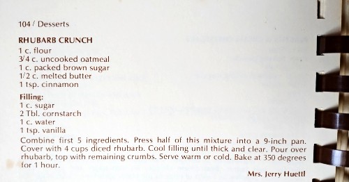 Rhubarb Crunch Recipe submitted by Mrs. Jerry Huettl